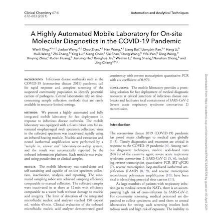 這一抗疫利器的研發(fā)成果以題為"A Highly Automated Mobile Laboratory for On-site Molecular Diagnostics in the COVID-19 Pandemic"的研究論文于2020年4月在國(guó)際檢驗(yàn)醫(yī)學(xué)界權(quán)威雜志《臨床化學(xué)》(Clinical Chemistry)重磅發(fā)表,該論文詳細(xì)闡述了“輕騎兵”的性能特點(diǎn)和檢測(cè)能力等成果,得到了國(guó)內(nèi)外廣泛關(guān)注。該項(xiàng)重量級(jí)抗疫攻關(guān)科研成果的發(fā)表,為新冠病毒核酸檢測(cè)移動(dòng)實(shí)驗(yàn)室快速部署醫(yī)療診斷系統(tǒng)提供了一種有發(fā)展前景的解決方案,有助于控制新冠病毒的區(qū)域性傳播。