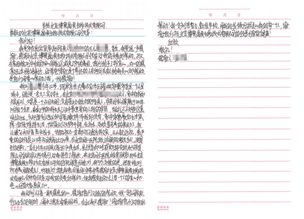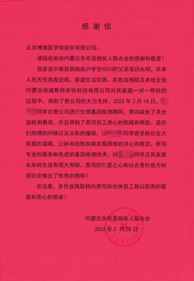 我縣諾爾鎮(zhèn)貧困殘疾戶學(xué)生xxx父親雙目失明,其本人先天性高度近視,家庭生活貧困。在我縣殘聯(lián)及本地企業(yè)內(nèi)蒙古哈維斯特農(nóng)牧科技有限公司對其家庭一對一幫扶的過程中,得到了貴公司的大力支持。2022年2月18日,xxx同學(xué)在貴公司進(jìn)行生物基因檢測期間,貴司減免了其全部檢測費(fèi)用,并且得到了貴司員工悉心的照顧和幫助。是你們熱情的問候以及無私的援助,讓xxx同學(xué)感受到社會(huì)大家庭的溫暖,讓她有戰(zhàn)勝疾病克服困難的決心和意志。貴司專業(yè)的服務(wù)和先進(jìn)的基因檢測技術(shù),對xxx同學(xué)及其家庭未來的生活有很大幫助。貴司的仁愛之心和社會(huì)責(zé)任感為和諧社會(huì)做出了優(yōu)秀的榜樣!