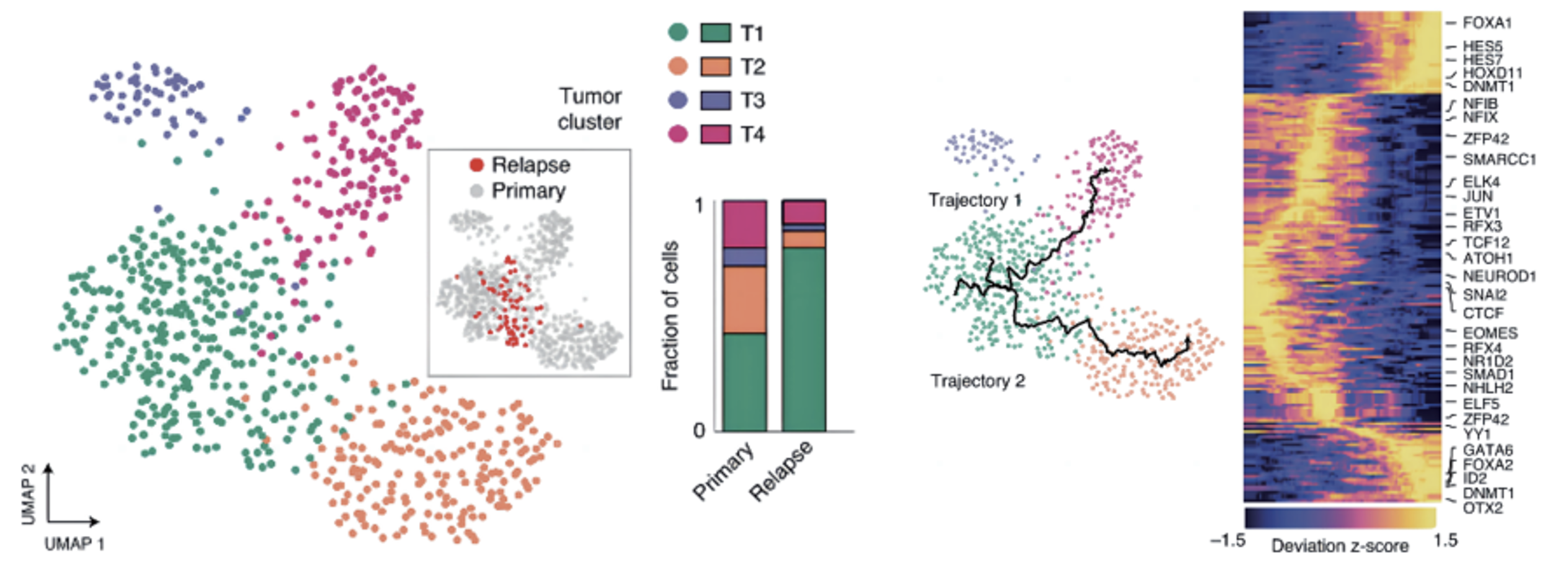 數(shù)據(jù)表明樣本共分為4類細(xì)胞亞群,其中復(fù)發(fā)腫瘤細(xì)胞T1亞群占比最高,該群細(xì)胞H3K27me3的信號(hào)弱并且細(xì)胞干性相關(guān)的基因活躍,具有向其他細(xì)胞類群發(fā)育的潛力。